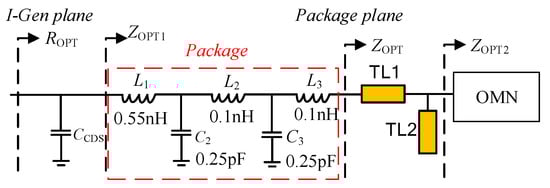 In this section, a closed method is presented in detail to design the extended efficiency range symmetrical DPA based on the above-mentioned theories. In order to validate the proposed method, a DPA with extended efficiency range was designed using CGH40010F GaN HEMT, based on Rogers R4350B substrate. The drain voltage Vds was set at 28 V. The gate voltage of the carrier PA Vgs1 was −2.8 V and the gate voltage of the peak PA Vgs2 was −5.7 V. The optimum load impedance ROPT is determined as 32 Ω for CGH40010F considering Vknee. Load-pull simulation should be processed in the ADS software to obtain the optimized load impedance ZOPT at the package plane, for deriving package parameters. Fortunately, the package parameters of CGH40010F can be found from [], shown in Figure 7. As shown in Figure 7, the package parameters are included for consideration in the practical design process.