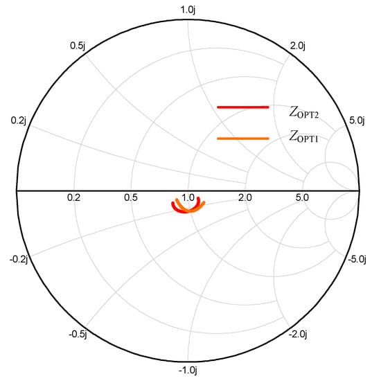 Firstly, the OBO should be determined; in this work, a 10 dB OBO was chosen. Then, load impedance ROPT, γROPT of carrier and peak device can be calculated using Equation (15), respectively. The value of γ was 0.85. The load impedance at the combine node ZL should be set, and was determined as 15·(1 + 0.9) Ω. Thirdly, load-pull simulation should be used to derive the CDS and the package parameters of transistor. In this work, a general transistor CGH40010F was taken, and its parameters have been reported in previous papers. So, this step can be omitted. Micro-strip line TL1 and TL2 should be added to eliminate the package influence on accuracy of OMN, owing to the fact that ABCD transfer matrices of OMN are derived including CDS, and excluding package parameters. By selecting and optimizing the appropriate impedance and electrical length of the microstrip lines TL1 and TL2, the parasitic parameters can effectively be cancelled. Figure 9 shows the simulated value of impedances ZOPT1 and ZOPT2 that are labeled in Figure 7. It can be seen from Figure 9 that ZOPT1 and ZOPT2 have no large deviations. It confirms that the parasitic parameters are effectively eliminated by using microstrip lines TL1 and TL2. Then, the parameters value of (OMN)C and (OMN)P can be calculated based on Equations (17)–(24). The designed (OMN)C and (OMN)P based on the obtained values are shown in Figure 10.