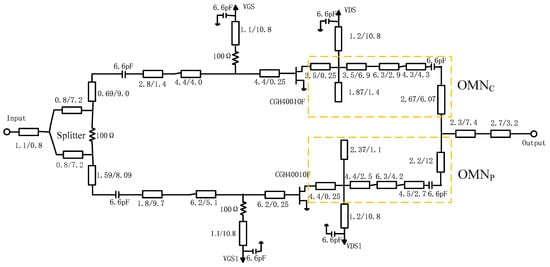 Stepped impedance matching technique is used to synthesize suitable input matching networks and provide a targeted saturation gain of around 10 dB. A resistor R was added to the gate dc bias circuit to ensure the stability of both transistors. Before the input matching networks of PAs, a 3-dB Wilkinson divider was first employed to split the signal. Offset lines were also added in the input networks, to ensure that the signals of the carrier and peak branches were in phase at the combine node. Its circuit schematic is also shown in Figure 10.