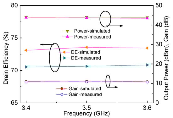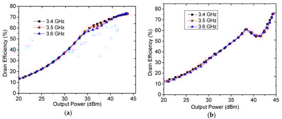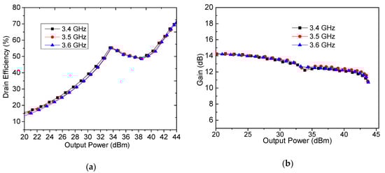 Performances of the designed DPA were tested using continuous wave signals. Measured output power, drain efficiency and gain are plotted in Figure 16 and Figure 17. Seen from Figure 16, it can be observed that the saturated output power is 43.4–43.7 dBm, and the saturated drain efficiency is 70.5–70.8% in the frequency range of 3.4–3.6 GHz, while gain is between 10.7 dB and 10 dB. Figure 17 shows that drain efficiency at the 6 dB power back-off is 62.4–64.3%. At the 10 dB power back-off, drain efficiency can be larger than 50% (50.3–52.6%).