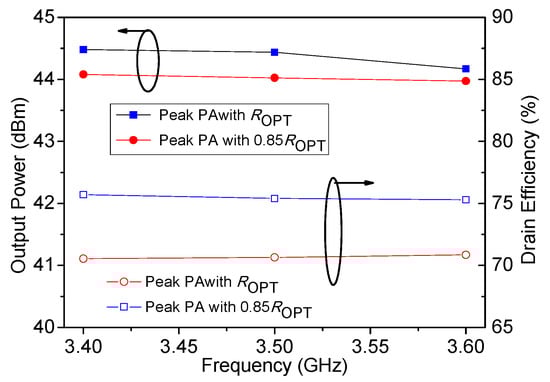 Figure 11a,b show that the proposed DPA with load impedance 0.85 ROPT of peak PA has a larger OBO compared to that of the conventional DPAs with load impedance ROPT of the peak PA. This verifies the effectiveness of the proposed method. It also can be seen from Figure 11a that around 55% drain efficiency can be obtained at the 11 dB power back-off. Regarding saturated output power and drain efficiency, these are reduced by about 13% compared with that of conventional DPAs as shown in Figure 12. These simulated performances of the DPA validate the previously described theories. 0.85 ROPT of peak PA is selected, to sacrifice a certain amount of output power and efficiency in the saturation state in exchange for larger OBO.