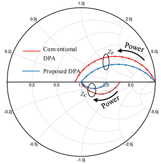 Figure 13 shows the simulated impedance traces that are consistent with the theories. As shown in Figure 13, in saturation, the load impedance of the peak PA is about 0.85 ROPT, which is close to the theoretical value. The load modulation trajectories of the carrier PA also illustrate a larger OBO range compared to that of traditional DPAs. The load modulation trajectories of the proposed DPA are closer to the real axis, which means higher efficiency can be achieved, compared to that of the traditional DPA.