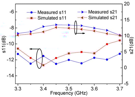 In order to demonstrate the actual performance of the designed DPA circuit, a DPA was fabricated based on the circuit schematic designed in the previous section. Figure 14 is a photograph of the fabricated DPA. The small signal characteristics S-parameter are firstly tested. The simulated and measured S-parameters are plotted in Figure 15.