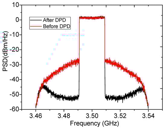 In order to characterize the linearity of the implemented DPA, the adjacent channel ratio (ACLR) was tested by using an LTE signal with a bandwidth of 20 MHz and peak-to average ratio of 9.5 dB. The measured ACLR with an average output power of 34.0 dBm is plotted in Figure 18. It can be observed that the ACLR is better than −29.4 dBc at 3.5 GHz. After adopting digital pre-distortion technology (DPD), the ACLR value is better than −53.6 dBc.
