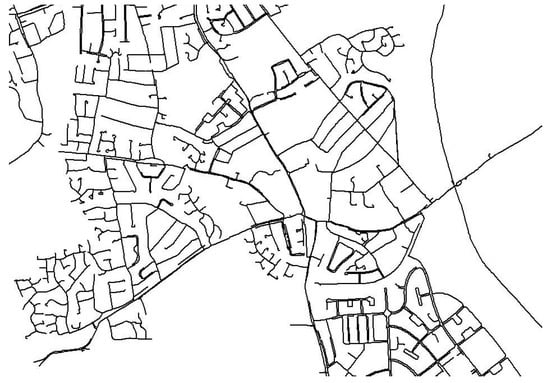 Water distribution and wastewater infrastructures are aging and are in regular need of costly maintenance. The buried pipe network for water and wastewater in the UK is around 800,000 km in combined length [], and the UK’s water infrastructure is the product of over 250 billion pounds of investment []. It is estimated that over 3000 million litres of water are lost to leaks every day in the UK []. Mobile robots could be used for autonomous, persistent monitoring of a buried pipe network, locating faults and returning to an operator to report the information. The aim would be to reduce the resources required for manual inspection, to improve the spatial coverage and frequency of inspection, and thereby to improve the overall resilience of the water services. An example water pipe network that such a robot would operate in is given in Figure 1.