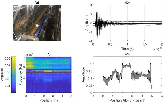 The data in this work are similar in nature to that reported in our previous work [,]; however, it has been extended from a 0.4-m pipe to a 5-m pipe, shown in Figure 2a. The process of acquiring the spatially varying signal is the same as in a previous work []. Examples of the time-domain acoustic response recorded at different points along the pipe are shown in Figure 2b. The Fourier transforms of these responses are found, which are shown in Figure 2c.