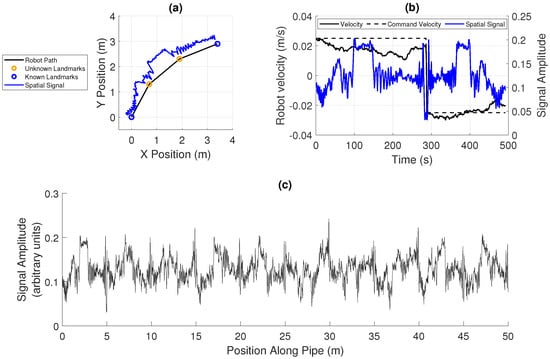 The creation of synthetic 1D data based on the experimental data: (a) the spatially varying acoustic signal superimposed on the trajectory of the robot along a pipe, illustrating how the signal would vary in the semi-two-dimensional space; (b) the motion of the robot along the pipe in each direction, where a fixed command velocity is given, the robot’s actual velocity drifts with additive noise, and the spatial signal can be seen to be warped due to this drift; and (c) a larger set of spatial signal data, simulated based on the experimental data.