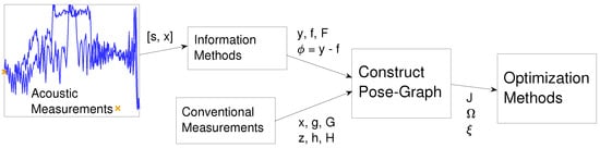 An illustrative block diagram outlining the process described in Section 3: the symbols on each arrow describe the variables output from the functions described by a block. Each symbol is defined within Section 3. A typical pose-graph optimization would optimize a pose graph constructed using conventional measurements. This work augments the pose graph with information from acoustic measurements. The iterative nature of the process is not illustrated; the whole process is repeated for each new estimated trajectory x output from the optimization.