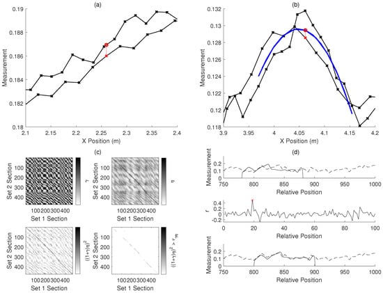Illustrations of methods of taking information from the measurements of the spatially varying acoustic property: the information is used in the pose-graph optimization to improve the robot trajectory estimate. (a) The function of the linear fit method: the two sets of poses and measurements (black crosses) should be aligned. The measurement at the pose in red (at 2.260 m) is predicted to be at the value of the red circle on the line between the two neighbouring points (at 2.255 m and 2.276 m). (b) The function of the quadratic fit method: the two sets of poses and measurements (black crosses) should be aligned. The measurement at the pose in red (at 4.062 m) is predicted to be at the value of the red circle on the quadratic fit of the nearby points (shown in blue). (c) An illustration of the cross-correlation method: an example of the matching parameters used to find correspondences in the two sets of data split into the labelled sections. is the cross-correlation coefficient between the sections, is the inverse of the sum of squared error between the sections, and is the parameter used to determine matches between sections by comparison to a threshold . (d) An illustration of the phase-correlation method used to find the offset between the sections of the signals in two sets of measurements: the two misaligned sections ( and ) are shown in the first plot. The second plot shows the cross-power function r, where the position of the largest value should correspond to the position shift which best aligns the two sections. The aligned sections are shown in the third plot.