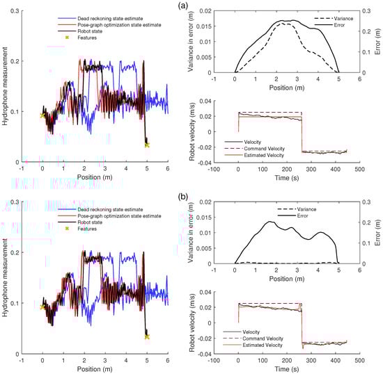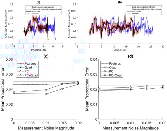 The study presented here has demonstrated the advantages of using the acoustic signal with pose-graph optimization; however, there were challenges to overcome in the implementation of this method. The first challenge was that the addition of the information methods in Equation (9) can affect the convergence of the estimation algorithm: the data points from the matching and prediction functions are dependent on the model being fit to the data and, therefore, are dynamic and change at each iteration of the solution. This can lead to an increase in the residuals and divergence of the estimation algorithm, and therefore, more robust optimization algorithms are considered. The second challenge was the optimal choice of parameters for the information methods, such as the size of sequences of measurements to be matched or the choice of function to fit to the acoustic signal. Simultaneously using a range of parameters reduces the sensitivity to the choice of parameters at the cost of computational complexity.