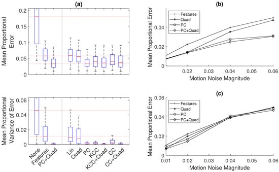 The phase-correlation matching method is seen to be more effective at higher magnitudes of motion noise, which is expected as the initially poorly aligned signal estimates would benefit more from approximate global alignment. The prediction method, especially in combination with the matching method, is seen to be more effective at larger magnitudes of measurement noise where the matching methods are less able to find matching sequences of measurements.