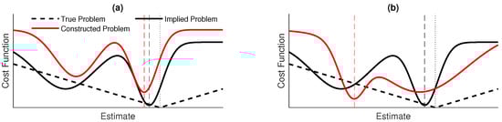 A simplified illustration of the cost functions considered in this work: in this example, the aim would be to find the estimate which minimizes the cost function. The quality of a cost function is measured by how close its minimum is to the minimum of the true problem, which would correspond to the correct estimate. However, this is not possible directly. The implied problem is to find a trajectory estimate which is consistent with respect to measurements. This is not done directly and, instead, a cost function is defined, creating the constructed problem using the functions defined in Section 3.3. Shown are (a) A constructed problem which matches well with the implied problem and (b) a bad constructed problem.