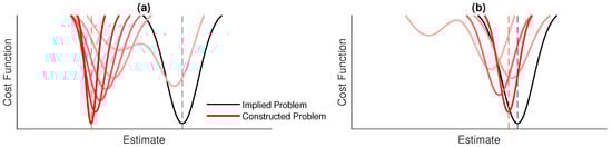 A simplified illustration of the dynamic cost functions considered in this work: the constructed problem is designed to be a good match to the implied problem, so that the minimum of the implied problem can be approximately found. However, the constructed cost function is dynamic and changes as the optimization progresses. Illustrated are (a) the cost function diverging from the implied function and (b) the cost function converging towards a good approximation to the implied function.