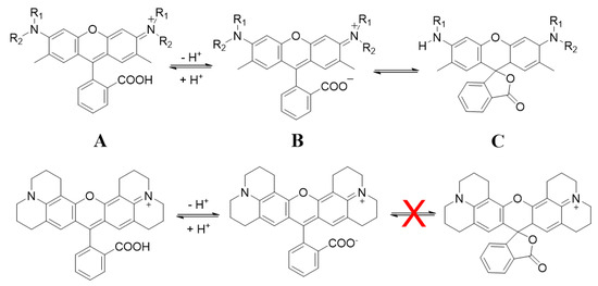 (top) General molecular structures of rhodamines in equilibrium and (bottom) structure of Rhodamine 101 (R101): cationic (A), zwitterionic (B), and lactone (C) forms.