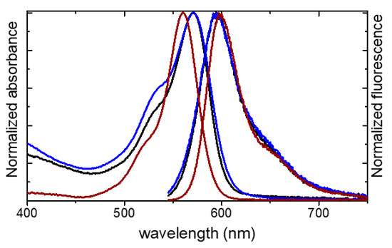 Normalized absorption and emission spectra for MSN-C-R101-70-PEG (black), MSN-S-R101-60-PEG (blue), and rhodamine 101 (brown) in diluted aqueous solution.