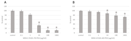 Results of MTT assay for MSN-C-R101-70-PEG (A) and MSN-S-R101-60-PEG (B). Stars indicate significant differences with respect to controls according to the Kruskal–Wallis test followed by the Dunn’s test (p < 0.05).