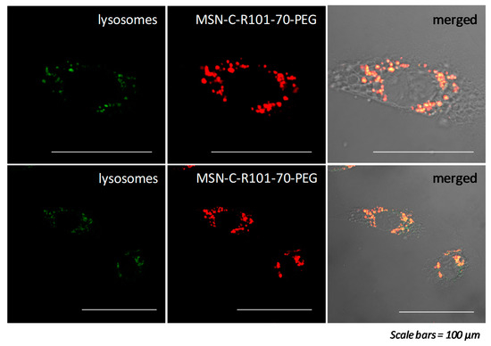 Based on the confocal microscopy analysis, MSN-C-R101-70-PEG were internalized in the cells and specifically accumulated into the lysosomes as shown by the subcellular localization experiments (Figure 6), where the lysotracker (green) and the nanoparticles (red) were co-localized (yellow). The fact that these NPs are localized into lysosomes indicates that they are possibly taken up by endocytosis, as widely reported for silica NPs at similar size range [82,83]. Note that the nanoparticles offer a sharper quality in the bioimaging of lysosomes with respect to commercial lysotrackers. Thus, results indicate that MSN-C-R101-70-PEG could be potentially employed as an alternative lysotracker in cancer cells or other cells that express FR on their plasma membrane. Nevertheless, further studies are needed to confirm it.