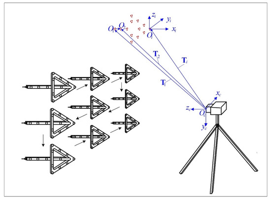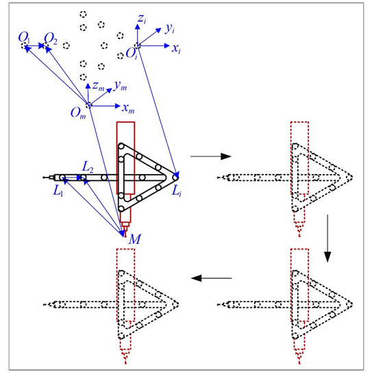 - Determine the z-axis of . The fifth to 13th control points are designed to be coplanar. Actually, they are not strictly coplanar because of the machining and installation error. Therefore, a plane is fitted using their new translation vectors . The direction of its unit normal vector, which can be denoted as , is used as the z-axis of .