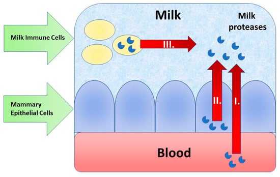 Proteolytic systems are inseparable part of all kinds of milk. They regulate the protein content in milk, and they are also regulated. Like other proteins, they differ in all mammal species. It is not unique for certain protease systems to be absent in one species and to be the most prominent for another. Proteases of these systems are excreted as inactive zymogens. They are later activated by the cleavage of specific peptide bonds. There are several ways how milk can obtain proteases (Figure 1). Proteases can either get into the milk via the blood stream or are released by the mammary epithelial cells. Lastly, milk contains immune cells that can also release proteases into the milk environment [13].