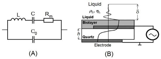 (A) Butterworth-van-Dyke (BvD) equivalent circuit. C0 = εA/h is the parallel electrical capacitance, L = 1/ω2C is the motional inductance (proportional to the mass), C = 8K2C0/(Nπ)2 is the motional capacitance (inversely proportional to the stiffness) and Rm = ηq/μqC is the motional resistance related to the dissipative losses. A is the electrode area, ε and h are the dielectric permittivity and thickness of the crystal, respectively, ω = 2πf, where f is series resonant frequency, K is the electromechanical coupling coefficient and N is the integer. ηq is the effective viscosity, and μq is the shear stiffness. (B) Scheme of the propagation of the acoustic wave. ηL and ρL are the viscosity and density of the liquid, respectively. δ is the penetration depth.