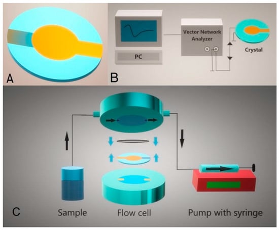 Schematics representation of the AT-cut quartz crystal with gold electrodes (A) and its implementation into the thickness shear mode (TSM) setting (B). Crystal is placed into the flow cell, and the liquid is added at the crystal surface using a syringe pump (C).