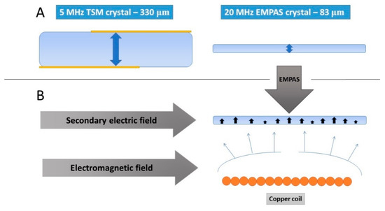(A) The design and the typical thickness of the quartz crystals for the TSM and electromagnetic piezoelectric sensor (EMPAS) applications. (B) Schematic representation of the generation of the oscillation by the secondary electric field in the EMPAS.