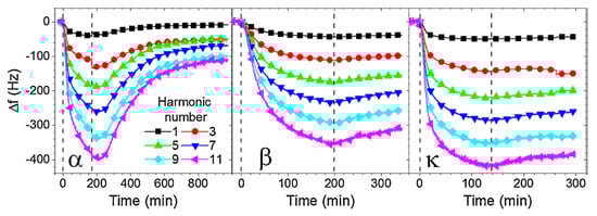 Kinetics of casein adsorption and removal from the SiO2 surface, as measured by a frequency shift (Δf) of the 1st–11th odd harmonics of the QCM-D. Exposure and removal of α-casein (left panel), β-casein (middle panel) and κ-casein (right panel) are marked by the first and second vertical dashed lines, respectively. Reproduced with permission of Elsevier from Tatarko et al. [62].