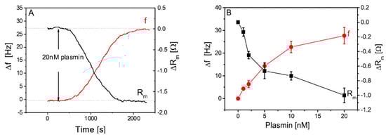 (A) Changes in the resonance frequency (Δf) and motional resistance (ΔRm) of the quartz crystal microbalance (QCM) transducer modified by a 1-mM peptide substrate and mercaptohexanol after the addition of 20-nM plasmin. (B) Plots of relative changes of the Δf and ΔRm, a function of plasmin concentration (Δf = f − f0 and ΔRm = Rm − R0); here, f0 and R0 are the frequency and resistance measured before the addition of plasmin, respectively. The results represent the mean ± S.D. obtained from 3 independent measurements performed for each concentration of plasmin. Reproduced with permission of Elsevier from Poturnayova et al. [63].