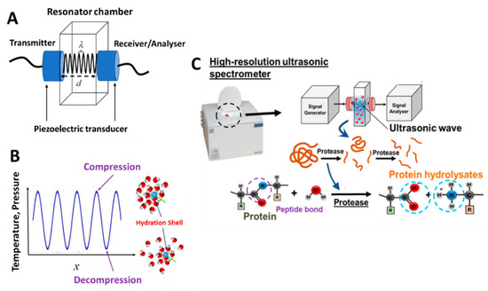 Ultrasonic spectroscopy (US) is a continuous ultrasonic wave-based analytical technique that utilizes a low amplitude, longitudinal deformation of high-frequency (1–20 MHz) acoustic waves propagating through the analyzed sample [71]. In contrast to traditional optical spectroscopic techniques, US probes the viscoelastic, rather than electric and magnetic, characteristics of the analyzed samples. Thus, most liquids have ultrasonic transparency. Among the measuring methods of an ultrasound, it belongs to a class of resonant ultrasonic-type techniques consisting of a fixed couple of emitting–receiving piezoelectric transducers (LiNbO3) located at opposite side walls of a resonator chamber with a pathlength, (Figure 8A) [74]. In the resonance chamber, the analyzed sample is typically filled in. The emitting transducer generates and propagates the ultrasonic wave through the sample and towards the receiving transducer. Following this, the propagating waves are reflected and forth through the sample multiple times, creating a positive interference. By principle, resonance occurs when is an integer number, , of the half wavelength, , i.e., . The interference creates a higher amplitude resonance peak at frequency, , which is detected and measured. This provides the high-precision measurements of ultrasonic wave characteristics such as the ultrasonic velocity, , determined from the resonance frequency of the solution, and ultrasonic attenuation, , which is the ultrasonic energy losses given by the bandwidth of the resonance peak.