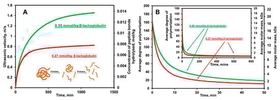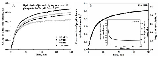 (A) Ultrasonic velocity profiles of the hydrolysis of β-casein treated with trypsin in 0.1-M phosphate buffer, pH 7, at 25 °C, measured at four different frequencies. (B) The corresponding hydrolytic profiles translated from ultrasonic velocity profiles in Figure 9A using (= 0.115 kg mol−1) determined from ultrasonic calibration with the trinitrobenzene sulfonic acid (TNBS) assay method. The concentration of the peptide bonds hydrolyzed (primary y-axis) is calculated using Equation (9), and the corresponding degree of hydrolysis (secondary y-axis) is calculated using the second Equation (13). The insert presents the reduction of the average degree of polymerization (primary y-axis) and average molar mass (secondary y-axis) calculated from the concentration of the peptide bonds hydrolyzed using Equation (14). The protein concentration is 5 mg mL−1, and the concentration of enzymes is 0.41 µM. Reproduced with permission of Elsevier from Melikishvili et al. [104].