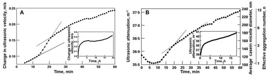 Among the recent ultrasonic techniques, high-resolution ultrasonic spectroscopy (HR-US) displays and offers numerous advantages over the optical methods and traditional ultrasonic technology, particularly for the real-time noninvasive precise monitoring of proteolysis reactions towards milk proteins by milk proteases in a volume. The capabilities of HR-US in monitoring a wide range of biocatalysts have been comprehensively described in reference [73]. However, examples of the HR-US application in a milk protein-protease system are very few. The HR-US monitoring of bioprocesses is based on the simultaneous measurements of changes of the characteristics of two major ultrasonic wave parameters: ultrasonic velocity, , and ultrasonic attenuation, , during a wave propagation caused by a change in the molecular characteristic. These ultrasonic parameters have different sensitivities to the physicochemical characteristics of molecules and their processes. Recent ultrasonic methodology emphasizes the experimental methods and data algorithms on translating both ultrasonic parameters into more useful quantitative biochemical transformations, such as real-time profiles of the evolution of the number of peptide bonds hydrolyzed per unit of time by means of calibration methods [73]. These real-time ultrasonic profiles are useful to provide kinetic and mechanistic descriptions of the proteolysis of milk proteins in terms of kinetic and thermodynamic parameters consistent with the enzyme kinetic models, as well as for process control and optimization.