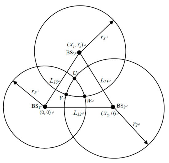 Because of the NLOS error, the circles partially overlap on each other, and the region is formed by the intersections. The true location of MS should be inside the overlap of three circles, which is surrounded by U, V, and W. U, V, and W are defined as the feasible intersections. Feasible intersections must meet the conditions of the following three inequalities: