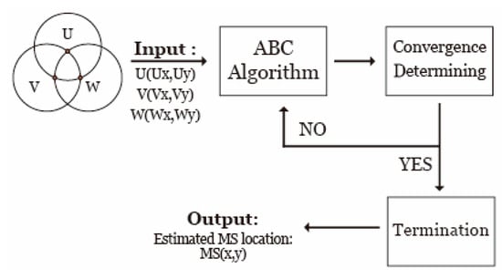 In this scheme, he ABC algorithm is applied to solve the constrained optimization problem. Each bee represents a horizontal coordinate and each food source is considered as a possible solution. In the ABC algorithm, two control parameters should be set prior, including the colony size and the limit value. Because of the differences in the searching range of the x and y coordinates, the coordinates of x and y cannot be regarded as a parameter with two dimensions. The ABC-based positioning algorithm is completed by operating on two parameters for the x and y coordinates to search for the best solution separately and simultaneously. However, the two parameters for the x and y coordinates are used together to calculate and compare the objective function value. In this step, the searching range is shown as Equation (15). If the ABC algorithm is regarded as a block diagram, the proposed positioning method can be simply presented as Figure 2. After the feasible intersections of U, V, and W are obtained, the proposed positioning method utilizes the ABC algorithm to estimate the MS location.