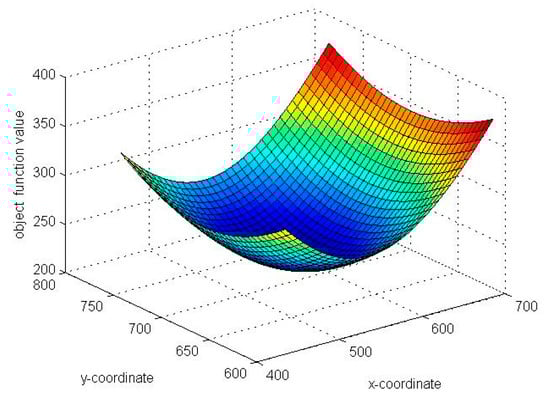 So, the considered positioning problem is reformulated to an optimizing problem. In the best situation, the feasible intersections of U, V, and W overlap with the minimization of the objective function value. The objective function value is equal to zero at this moment. By minimizing this objective function, the NLOS error can be decreased effectively. The considered optimizing problem can be described as minimizing the cost function with nonlinear constraints. The general constrained optimization problem is to find the MS location (x, y), so as to: