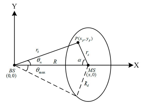 The NLOS error is the main reason that causes location accuracy with a bad performance. NLOS effects were taken into account for the analysis of simulations in this paper. Two typical error models were applied, one is the circular disk of scatters model (CDSM) [] and another one is a uniformly distributed noise model []. CDSM is the first introduced error model, which simulates the NLOS propagation environment. It assumes that the path of signal transmission between MS and BSs is not a straight path. One scatter spreading around MS in the circular disk is considered to obstruct the signal transmission. The signal is changed to go through a single reflection on the points of scatter. Therefore, the measured distance is reformulated by calculating the sum of two distances, including the distance between BSs and the scatters, and the distances between MS to the scatters. The measured distance would be increased according to the triangle theorem shown as Figure 5. P presents the scatter point. The real travel path is between MS and BS, but the measured ranges are the sum of rb and rs after the signal is interfered with by the scatter point. The AOA measurement is also affected in the CDSM error model. θn is the AOA measurement error. The scatter points in the circular disk are considered as the lower range error with a higher probability to appear. The maximum error value is when the scatter point is on the circumference. Thus, range error depends on the scatter radius; a bigger scatter radius with a larger measured error.