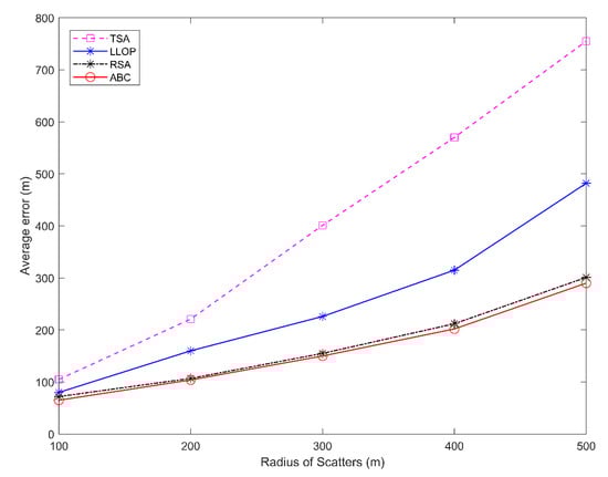 Figure 6 shows the average location error of the proposed ABC-based location algorithm compared with other existing methods in the CDSM error model. All methods increased the average error, with the longer radius of scatter. However, the proposed ABC-based algorithm has a lower average location error than TSA, LLOP, and RSA. The curve of the method we proposed has a relatively smooth curve. Compared with TSA, LLOP, and RSA, the simulation results show that the proposed algorithm has the best performance on the location accuracy and supports the estimation of MS location with the best accuracy.