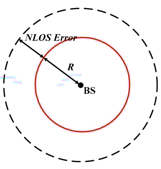 Generally, the propagation time can be measured by the MS and the base station (BS) in wireless cellular systems. Kinds of measurements are taken by the signals that travel between the MS and the BSs. According to different measurements, different known wireless location techniques are applied. Some of the most common schemes are the signal strength [], angle of arrival (AOA) [], time of arrival (TOA) [], and time difference of arrival (TDOA) []. In order to provide better accuracy, hybrid TOA and AOA methods were proposed []. In [], the authors utilized the improved linear-line-of-position to propose a TOA-based localization method for a 3-D environment. The accuracy of MS location estimation is affected by many factors, such as multipath, hearability, and non-line-of-sight (NLOS) propagation. One of the primary tasks for accurate location estimates in wireless communication location systems is NLOS propagation derived from the blocking of direct paths. NLOS often happens in an urban environment and can be considered as a dominant issue for time-based location estimation. The additional propagation time or distance may lead to significant degradations on location performance. In an ideal case, if the line-of-sight (LOS) propagation exists, the MS location can be derived successfully without error interference. However, an LOS propagation channel is hard to come by in a real environment.