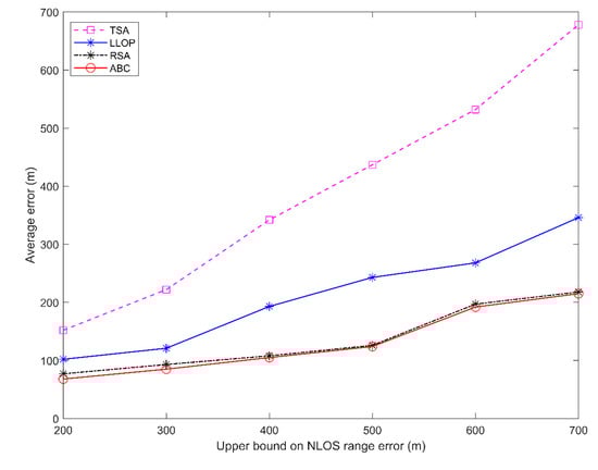 Average location error versus the upper bound of non-line-of-sight (NLOS) errors.