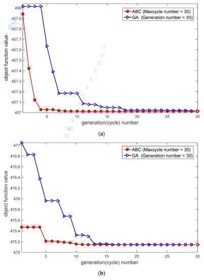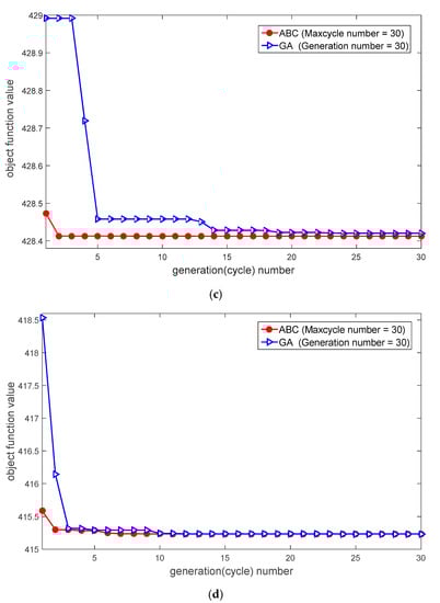 In each cycle, the ABC algorithm creates a new population in the searching range. Then, the employed bee phase, onlookers’ phase, and scouts’ phase are implemented serially. For the final cycle, the ABC algorithm memorizes the best solution and determines whether the formulated requirements are satisfied. If the convergence condition is satisfied, the loop will be terminated and the best food source will be outputted as the optimal solution. Otherwise, the bees go back to the employed bee phase. The cycles are iterated continuously until the condition is satisfied. Generally, the best solution can be derived from the optimal procedure of the ABC algorithm during the iterations.
