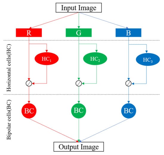 The horizontal cells stage is used to adjust the brightness of the input image with the 15 × 15 convolution. The 15 × 15 convolution is shown in Equation (1). Where the * represents the convolution operation, represent the input image, represents Gaussian convolution filters that is determined by the value (i.e., brightness) range of the central pixel. The is shown in Equation (2).