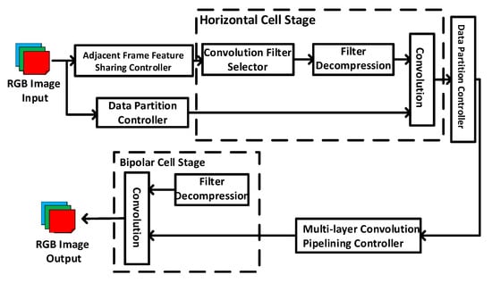 Figure 2 shows the architecture of the proposed biological retina inspired tone mapping processor. The processor implements the horizontal and bipolar cells stages in the biological retina inspired tone mapping algorithm as described in Section 2. In order to achieve high throughput and high energy efficiency, several hardware design techniques have been proposed and implemented in the processor architecture, including data partition-based parallel processing, adjacent frame feature sharing, multi-layer convolution pipelining, and convolution filter compression. The details of these techniques are presented as following.