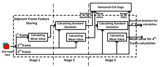 In order to reduce the read time and power consumption, we have proposed an adjacent frame feature sharing technique. The basic concept is to leverage the fact that for video processing adjacent input images have similar mean value and standard deviation. As shown in Figure 4, a three-stage processing architecture is designed to realize the concept. The first stage is used to calculate the mean value of the 1st frame. The second stage is used to calculate the standard deviation of the 2nd frame based on the mean value calculated from the first frame.