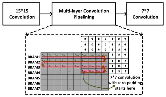 To reduce the power consumption, a multi-layer convolution pipelining architecture is designed. As shown in Figure 5, once a few number of data are generated by the 15 × 15 convolution, the convolution of 7 × 7 can be started immediately. As zero-padding is involved in the convolution, for completing an output data for 7 × 7 convolution, instead of waiting for 7 new rows of data, only 3 rows plus 4 data is required.