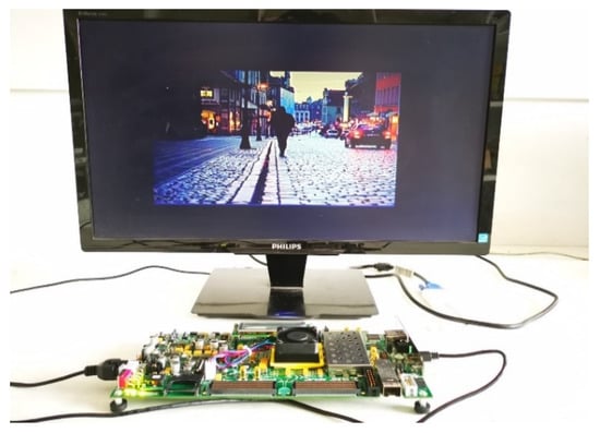 To evaluate and demonstrate the proposed biological retina inspired tone mapping processor, it has been implemented using a Xilinx Virtex 7 FPGA. Figure 7 shows the experimental setup. The input image is transferred from the computer to the FPGA. After processing, the processed image is sent to a monitor for displaying.