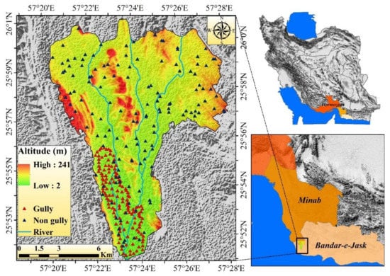 Biodiversity in a given area depends on, to a large extent, and supports the most vital natural resources in the soil, which also contribute to the provision of basic human needs such as food, fresh air, and clean water [1]. Therefore, human survival largely depends on the soil component. Soil erosion in the form of gully erosion is a serious global problem, and it continues to pose a threat to soil and water resources, particularly in arid and semi-arid regions of Iran [2,3]. Among the several types of water-induced erosion, gully erosion is a more intense form of soil erosion [4] and is one of the most complex geomorphic phenomena on the Earth’s surface [5]. Such erosional activities also change the shape of the Earth’s landform and produce a rugged topography, which is not suitable for production activities, construction of communication networks, etc. Thus, water-induced soil erosion is the main cause of the destruction of agricultural land, vegetation, and ecosystems, and is ultimately responsible for a devastating land degradation phenomenon. It has been estimated that the annual rate of global soil erosion is approximately 75 billion tons [6]. From an international perspective, Iran ranks second in terms of land losses, and the annual rate of soil erosion is close to 2 to 2.5 billion tons [7]. It has also been predicted that Iran’s average soil erosion rate is 30–32 tons/ha/year, which is 4.3 times the world average (Food and Agriculture Organization of the United Nations (FAO), 1984). In Iran, soil erosion has been estimated to have caused more than USD 1 billion in economic losses (FAO, 2015) and is a national threat [8]. Thus, it is necessary to protect the soil from erosion and to avoid the phenomenon of land degradation worldwide. The main cause of intensive water-related gully erosion and its development is a long hot/dry season followed by an extremely wet period. Therefore, extreme rainfall causes a large amount of surface runoff over the infiltration capacity and easily transports loose soil particles onto the downward slope. Thus, soil erosion related to water in Iran is a major barrier to sustainable development in the areas of agriculture, watershed management, and other activities related to resource development [9]. Hence, the preparation of a gully erosion susceptibility (GES) map is essential for sustainable management, development, and protection of the most vital natural resource on the Earth’s surface, i.e., soil, from intense gully formation and development.