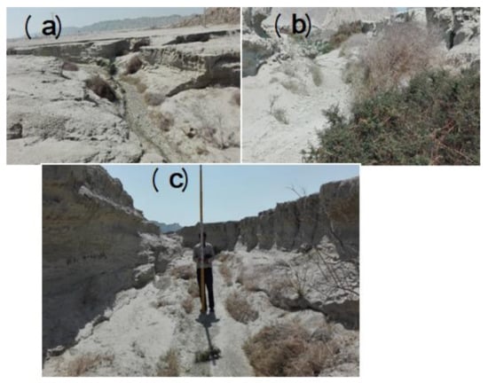 Images of gully erosion in Shirahan watershed: (a) head-cut gully; (b) gully erosion in salt land area; (c) measurement of gully morphometric properties.