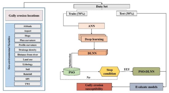 Methodological flowchart of particle swarm optimization (PSO)-deep learning neural network (DLNN) in gully erosion susceptibility.