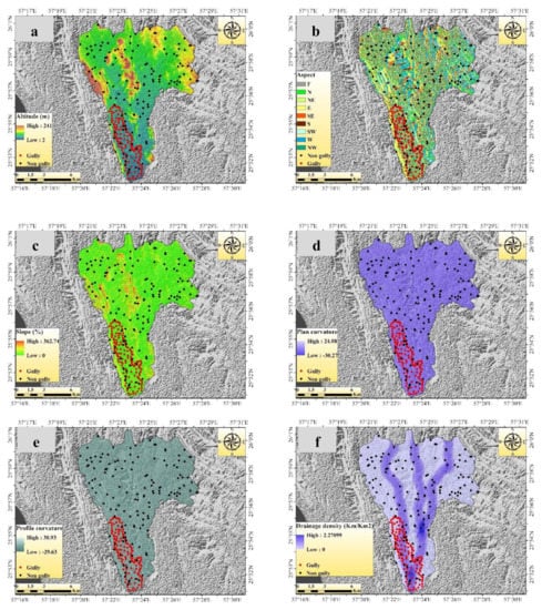 The altitude of the present study area ranges from 2 to 241 m (Figure 4a). Altitude is an important factor for the occurrence of gullies due to influences on rainfall-runoff processes, and it is largely employed in GES mapping [3]. Slope aspect indirectly affects the occurrence of gully erosion as it affects the reception of sunlight, vegetation cover, and humidity [33]. Here, the slope aspect map has nine classes, i.e., flat, N, NE, E, SE, S, SW, W, and NW (Figure 4b). Slope angle influences the pattern of runoff and infiltration rate. Therefore, depending on the slope, the erosional rate also varies from place to place, i.e., high slope areas have high erosion rates and vice versa. The slope map is shown in Figure 4c, and the value ranges from 0% to 362.74%. In a particular direction, the rate of gradient change is known as curvature, within which, plan and profile curvature generally represent the topographic characteristics of an area. The value of plan curvature ranges from −30.27 to 24.08 (Figure 4d) and profile curvature from −29.63 to 30.93 (Figure 4e). DD directly impacts occurrences of gully erosion. Horton’s (1932) following equation was used to calculate DD. In this study, the DD value ranges from 0 to 2.27 km/km2 (Figure 4f).