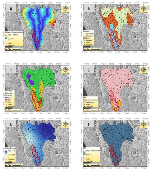 Distance from a river also influences occurrences of gully erosion as it greatly impacts the wetting capacity of surface area and associated erosional activities. The value of the distance from a river ranges from 0 to 4680.17 m (Figure 4g). The land use type of the area is very much responsible for the occurrence of gully erosion. Bare or less vegetated areas of the land surface are highly prone to gully erosion. In this study, four types of land use were recognized, i.e., agricultural land, rangeland, rock surface, and salt land (Figure 4h). The lithological factor of an area is highly responsible for erosional activities such as the development of a gully [34]. The present study area of Shirahan watershed consists of five types of lithological unit (Figure 4i). The soil map of the study area is shown in Figure 4j, and it is classified into two categories, i.e., entisols/aridisols and badlands. Rainfall is the most important factor for the formation of a gully and its development, mainly in the arid and semi-arid areas. High-intensity rainfall with short duration is the most devastating for gullies. Here, 28 years of rainfall data have been used to prepare a rainfall map (Figure 4k), and it ranges from 125 to 175 mm. SPI indicates the stream’s erosional capacity [25]. SPI value was calculated by using the following equations, and the value ranges from 0 to 2.625 in this research work (Figure 4l).