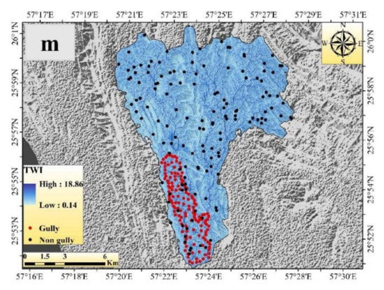 TWI determines transport capacity along with flow velocity [7], and it is an essential factor for identifying gully erosion-prone areas [35]. The following equation was used to calculate TWI value, and it ranges from 0.14 to 18.86 (Figure 4m).